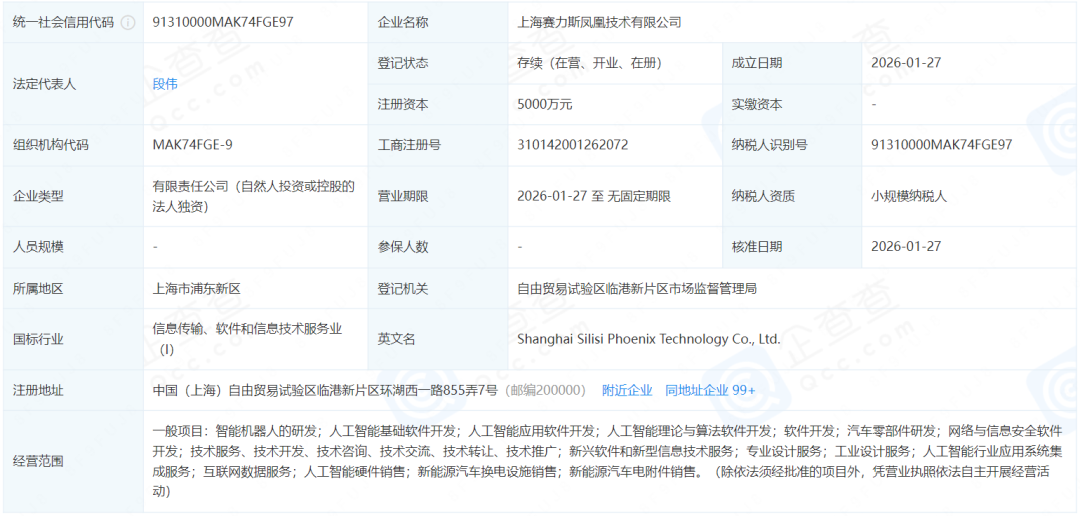 近日,上海赛力斯凤凰技术有限公司在上海临港新片区成立。该公司法定代表人为段伟,注册资本5000万元,经营范围涵盖智能机器人的研发、人工智能基础软件开发、人工智能理论与算法软件开发等前沿领域。